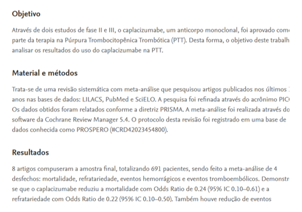 Nesse contexto, o Caplacizumabe pode ser administrado juntamente com plasmaférese diária e terapia imunossupressora, contribuindo para reduzir rapidamente a atividade da doença e melhorar o prognóstico do paciente.