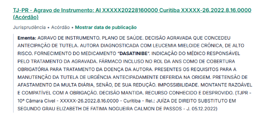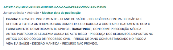 No contexto de fornecimento de medicamentos como o Dasatinibe (Sprycel) a liminar pode ser solicitada para que o SUS ou o plano de saúde forneça o medicamento antes da conclusão definitiva do processo.