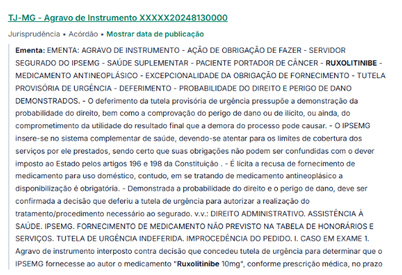 Em situações onde há recusa no fornecimento, os pacientes podem recorrer ao judiciário para garantir o acesso ao tratamento. Decisões judiciais têm frequentemente determinado que tanto o SUS quanto os planos de saúde forneçam o Ruxolitinibe (Jakavi) a necessidade médica e a ausência de alternativas terapêuticas eficazes.