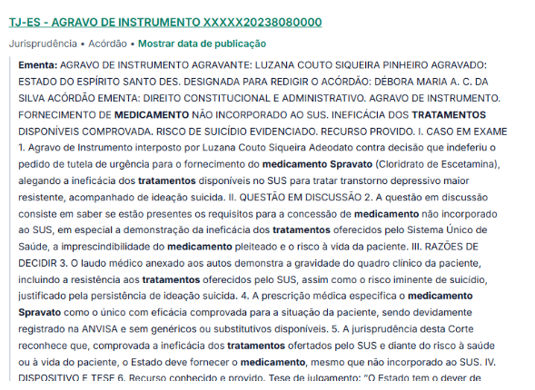 Em situações onde há recusa no fornecimento, os pacientes podem recorrer ao judiciário para garantir o acesso ao tratamento. Decisões judiciais têm frequentemente determinado que tanto o SUS quanto os planos de saúde forneçam o Spravato (Esketamina) a necessidade médica e a ausência de alternativas terapêuticas eficazes.