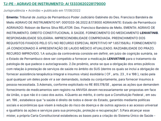 Em situações onde há recusa no fornecimento, os pacientes podem recorrer ao judiciário para garantir o acesso ao tratamento. Decisões judiciais têm frequentemente determinado que tanto o SUS quanto os planos de saúde forneçam o Lenvatinibe (Lenvima) a necessidade médica e a ausência de alternativas terapêuticas eficazes.