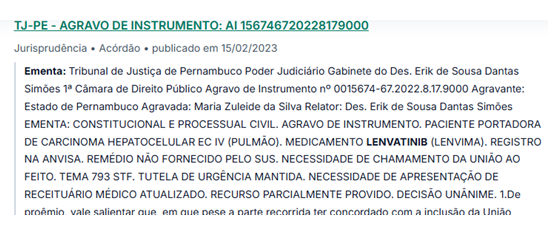 Sim, há diversas decisões judiciais favoráveis ao fornecimento do Lenvatinibe (Lenvima).