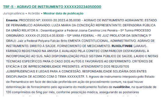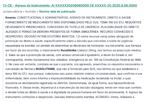 Sim, há diversas decisões judiciais favoráveis ao fornecimento do Ruxolitinibe (Jakavi).