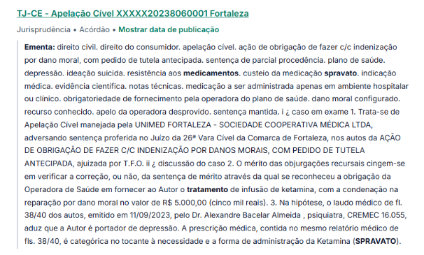Sim, há diversas decisões judiciais favoráveis ao fornecimento do Spravato (Esketamina).