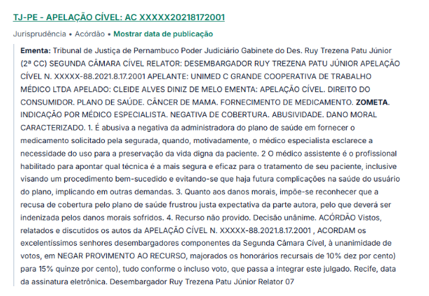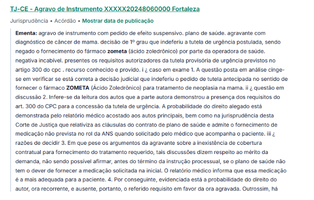 Em situações onde há recusa no fornecimento, os pacientes podem recorrer ao judiciário para garantir o acesso ao tratamento. Decisões judiciais têm frequentemente determinado que tanto o SUS quanto os planos de saúde forneçam o Zometa (Ácido Zoledrônico) a necessidade médica e a ausência de alternativas terapêuticas eficazes.